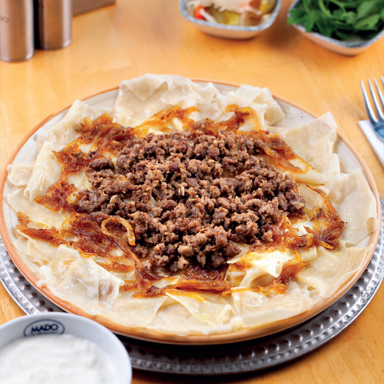 Dana əti, quzu quyruğu, duzlu xiyar, pomidor, pizza xəmiri, çeddar pendiri, kartof fri, ketçup, mayonez.