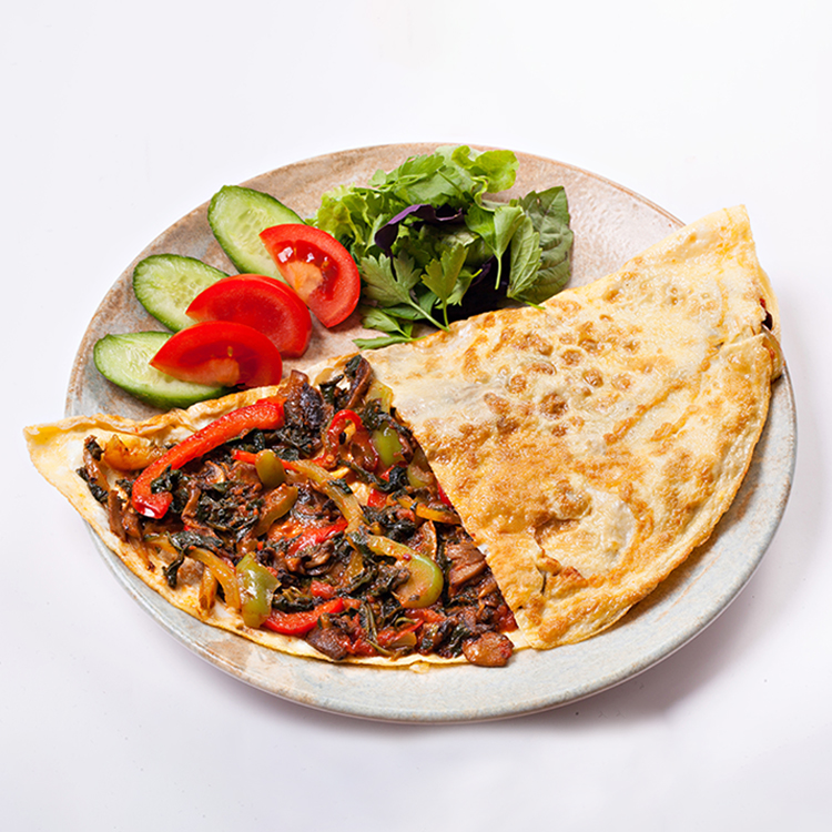 Yumurta, pankek xəmiri, özəl sous pomidor, göyərti, xiyar, kahı.