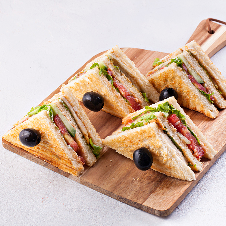Tost çörəyi, toyuq filesi, kahı, pomidor, duzlu xiyar.