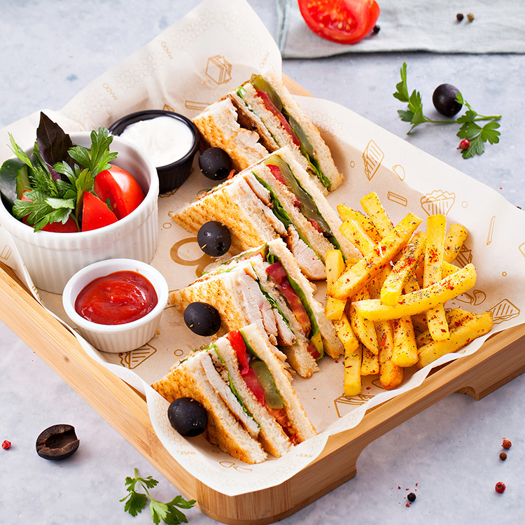 Tost çörəyi, toyuq filesi, kahı, dana vetçina, kaşar pendiri, pomidor, xiyar, duzlu xiyar, yumurta (istəyə görə), kartof fri, yaşıl salat, mayonez, ketçup.