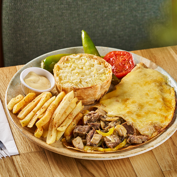 Ət köftə (dana əti, quzu quyruğu), badımcan, sarımsaq, qaymaq, kartof fri, pomidor, acı bibər, düyü plov, kaşar pendiri.