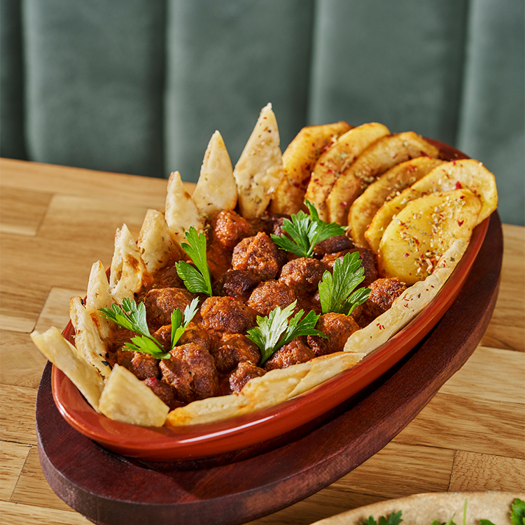 İzqara köftə (dana əti, quzu quyruğu), kərə yağlı dırnaq pide, pomidor, acı bibər, kartof, çəltik sousu, qatıq.