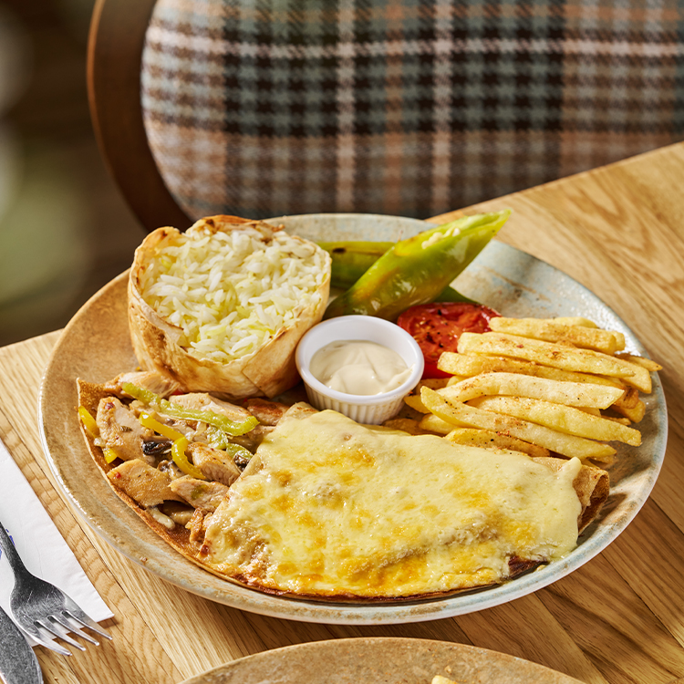 Toyuq filesi, pomidor, sivri bibər, tərəvəz sote, düyü plov, kartof fri, ballı xardal sousu, göbələk sousu, göyərti, ədviyyat.