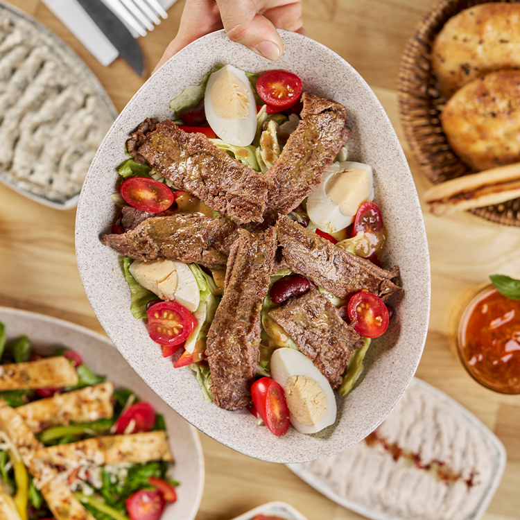 Can əti, qırmızı lobya, yumurta, rəngli bibər, kahı aysberq, çerri pomidor, balzamik sous.