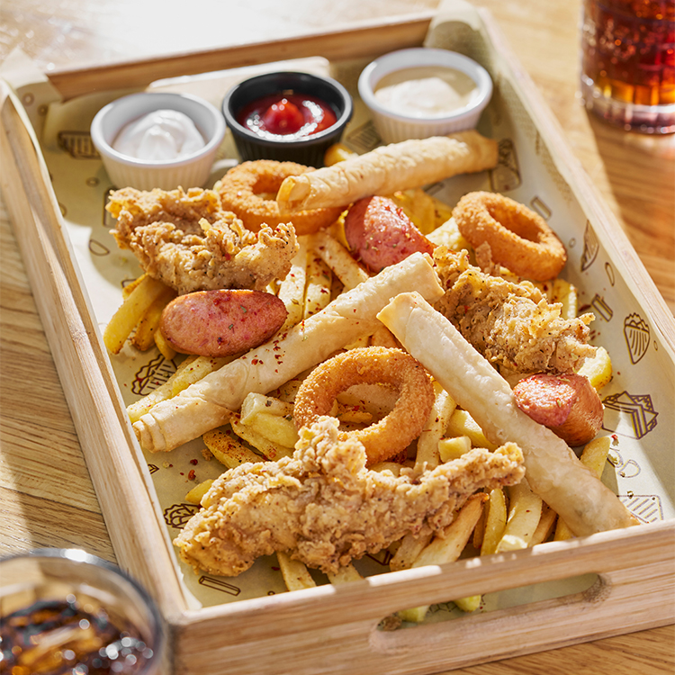 Toyuq filesi, siqara börəyi, soğan halqaları, sosis, kartof fri, mayonez, ketçup, ballı xardal sousu, ədviyyat.
