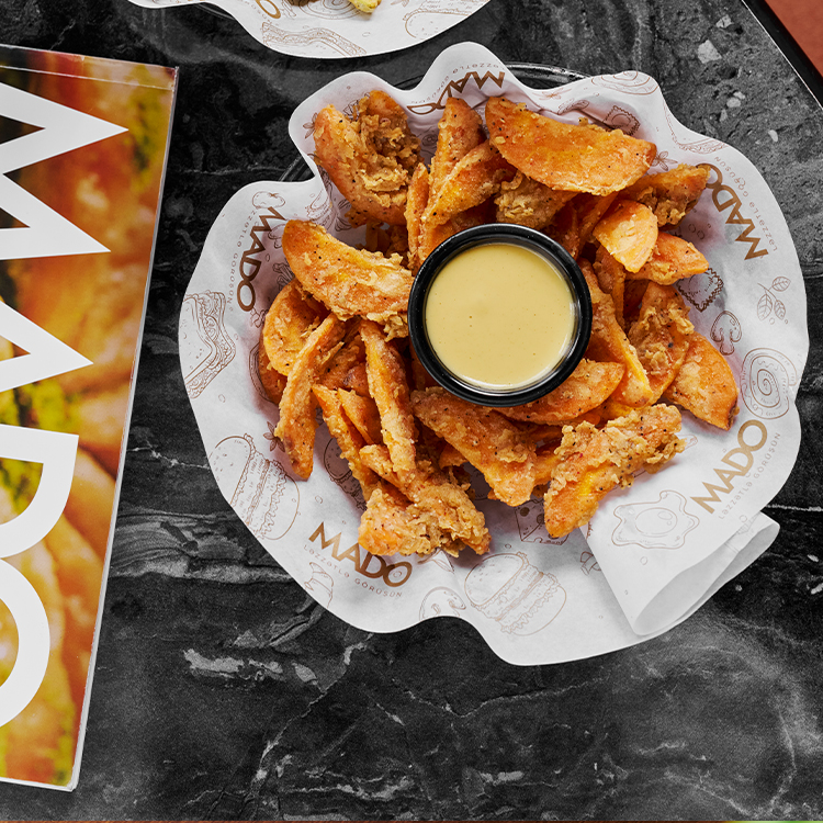Panko olunmuş mozzarella pendiri, kartof fri, mayonez, svit çili sousu.