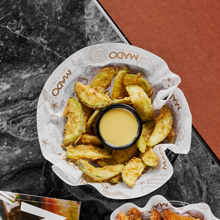 Panko olunmuş mozzarella pendiri, kartof fri, mayonez, svit çili sousu.