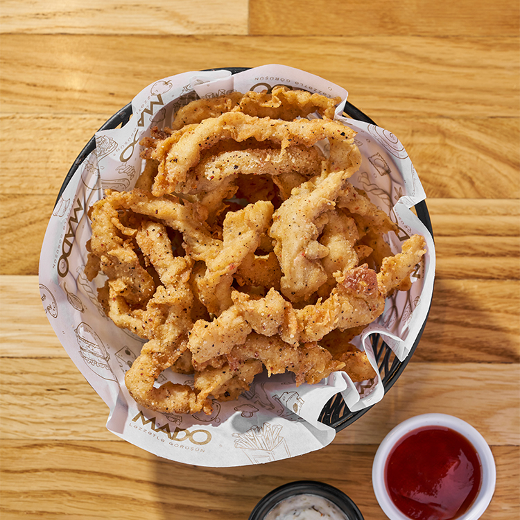 Krevet, kartof fri, panko olunmuş qabaq və kök çipsləri, xüsusi sous.
