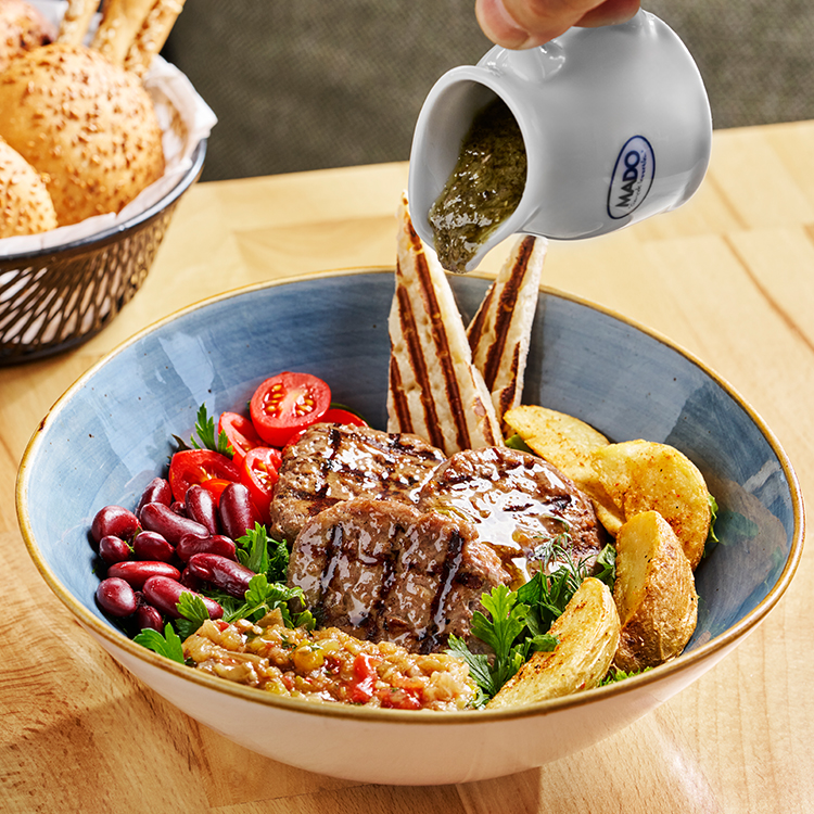 Ət köftə (dana əti, quzu quyruğu), kartof, qırmızı lobya, çerri pomidor, badımcan kürüsü (badımcan, bibər, soğan, pomidor), qızardılmış çörək, göyərti, xüsusi sous.Həcm