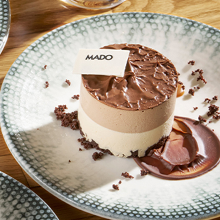 Badamlı merenqa, krem pendirli və qaymaqlı çizkrem, albalı frujel, mövsümə uyğun meyvələr.