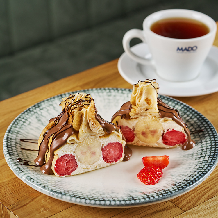 Krep xəmiri, banan, çiyələk, qaymaqlı krem, südlü şokolad.