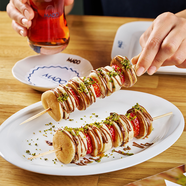 Pankek, banan, çiyələk, fıstıqlı qanaj, südlü qanaj, südlü qəpik şoklad, fıstıq.