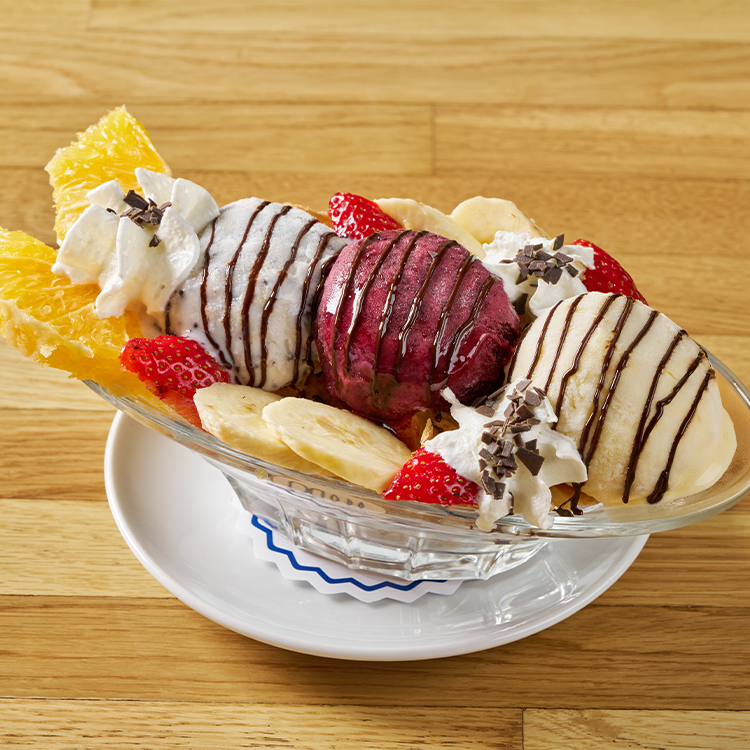Orange, blackberry ice-cream, ice-cream with pieces of chocolate, fruit salad, chocolate pieces, cream, chocolate praline, ice-cream cone pieces, .