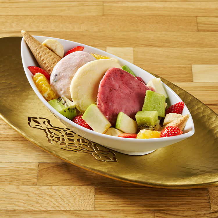 Portağallı, limonlu və qarışıq meyvəli dondurma, mövsümi meyvələr, kornet parçaları, şokolad dekoru.