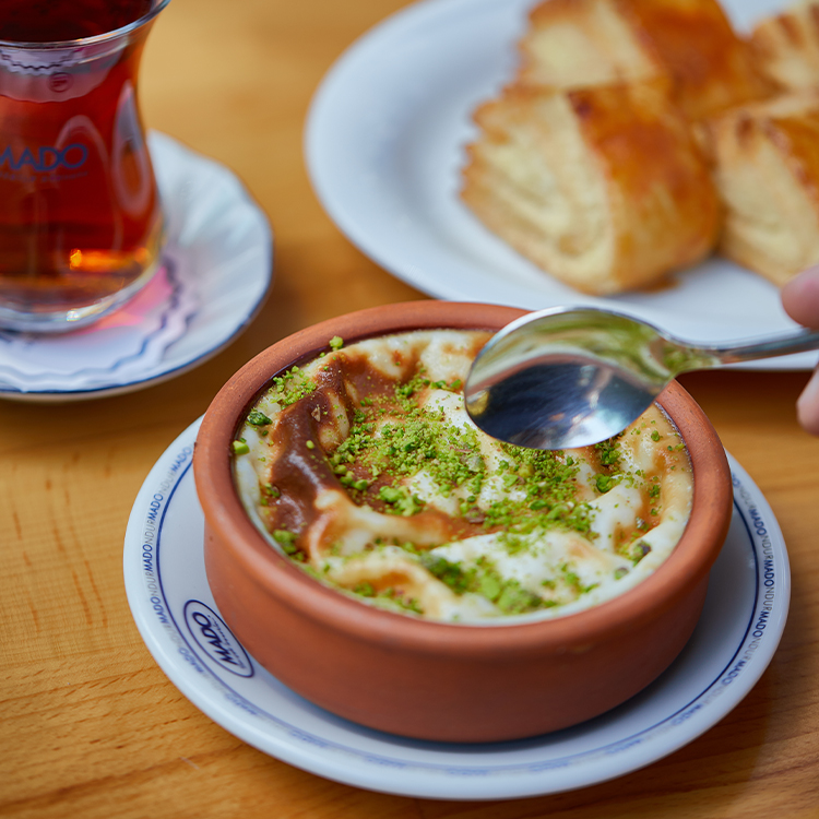 Qazandibi, fırın sütlaç, supangle, banan dilimləri, fındıq və fıstıq əzməsi.