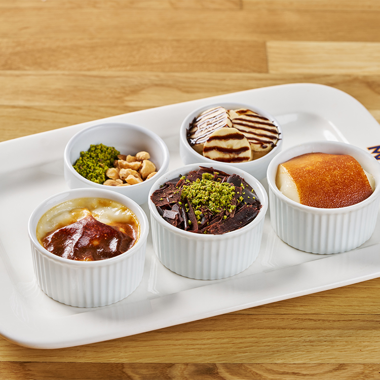 Qazandibi, fırın sütlaç, supangle, banan dilimləri, fındıq və fıstıq əzməsi.